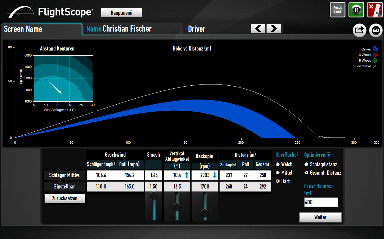 | Ball Flugbahn | Weiten mit verschiedenen Schlägern |